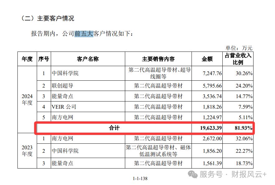 上海超导的客户集中度高得令人震惊。2022-2024年,公司前五大客户贡献的收入占比分别达到74.24%、87.45%、81.93%,连续三年维持在80%左右的高位。